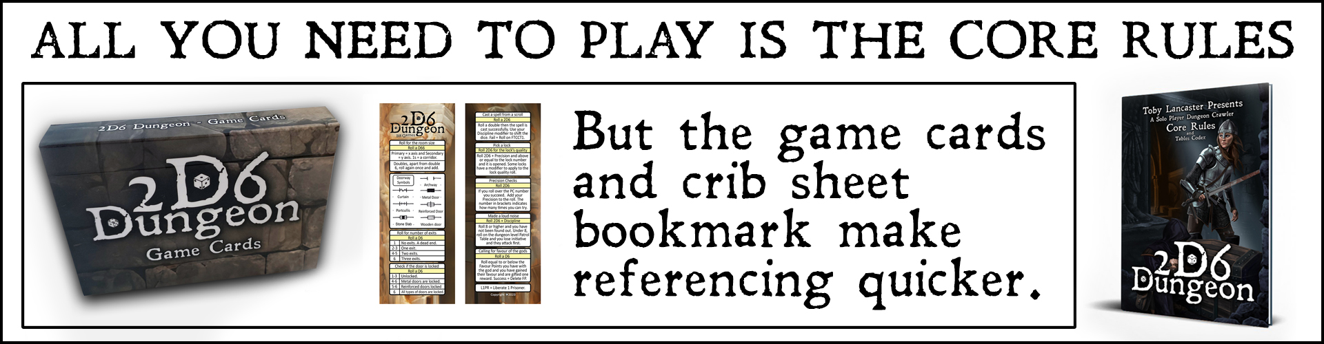 Here are four videos showing Toby the designer playing 2D6 Dungeon. Not only do they show gameplay but also are a handy tool to learn the rules.